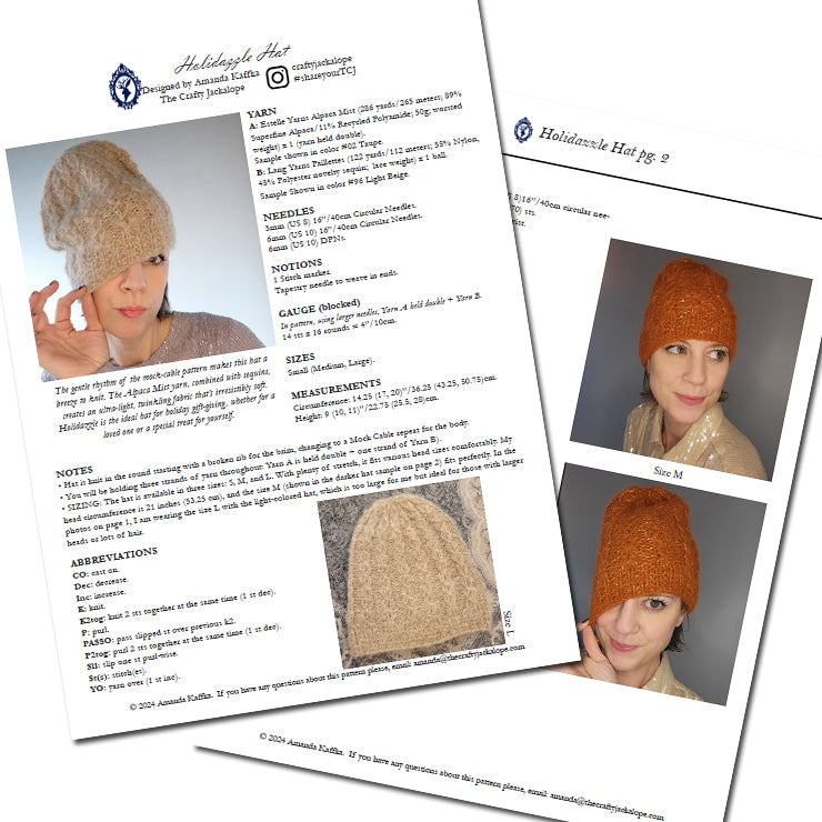 The gentle rhythm of the mock-cable pattern makes this hat a breeze to knit. The Alpaca Mist yarn, combined with sequins, creates an ultra-light, twinkling fabric that’s irresistibly soft. Holidazzle is the ideal hat for holiday gift-giving, whether for a loved one or a special treat for yourself.