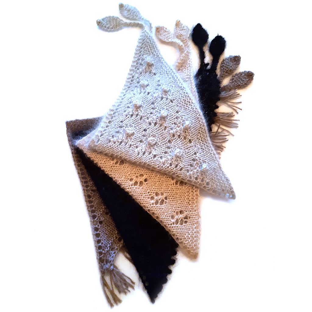 These special mini-sized triangle shawls are like little hugs around your neck. They can be worn in so many ways: bandana-style with the ties in the front or back; or on your head like a headband-handkerchief, to name a few. They are the perfect gift for anyone, even your pets! When you, your friends, family or furry companions wear a Hug-Kerchief, they will be wearing a hug from you.