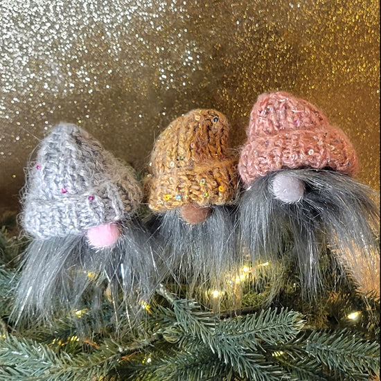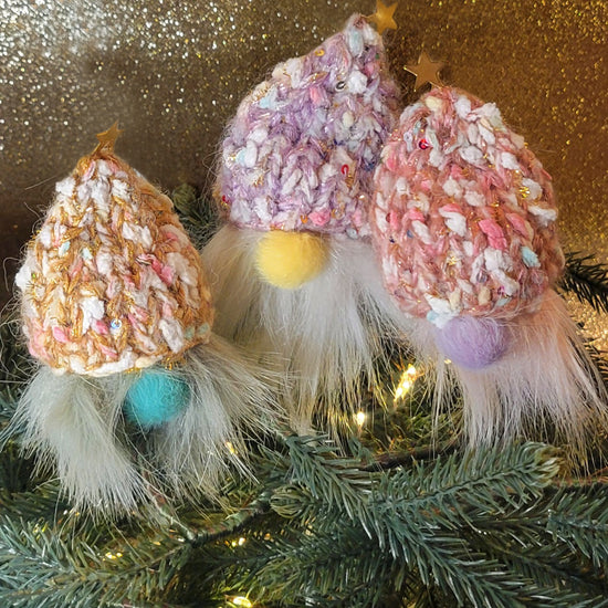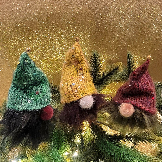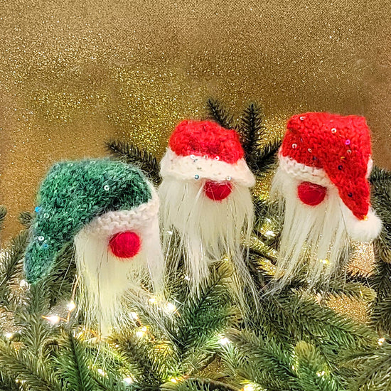 Bling holiday cheer to your needles with these adorable SETS of THREE knit kits! Whether you're decking the halls, decorating the tree, topping a gift, or adding whimsy to your project bag, this jolly gnome is ready to charm!