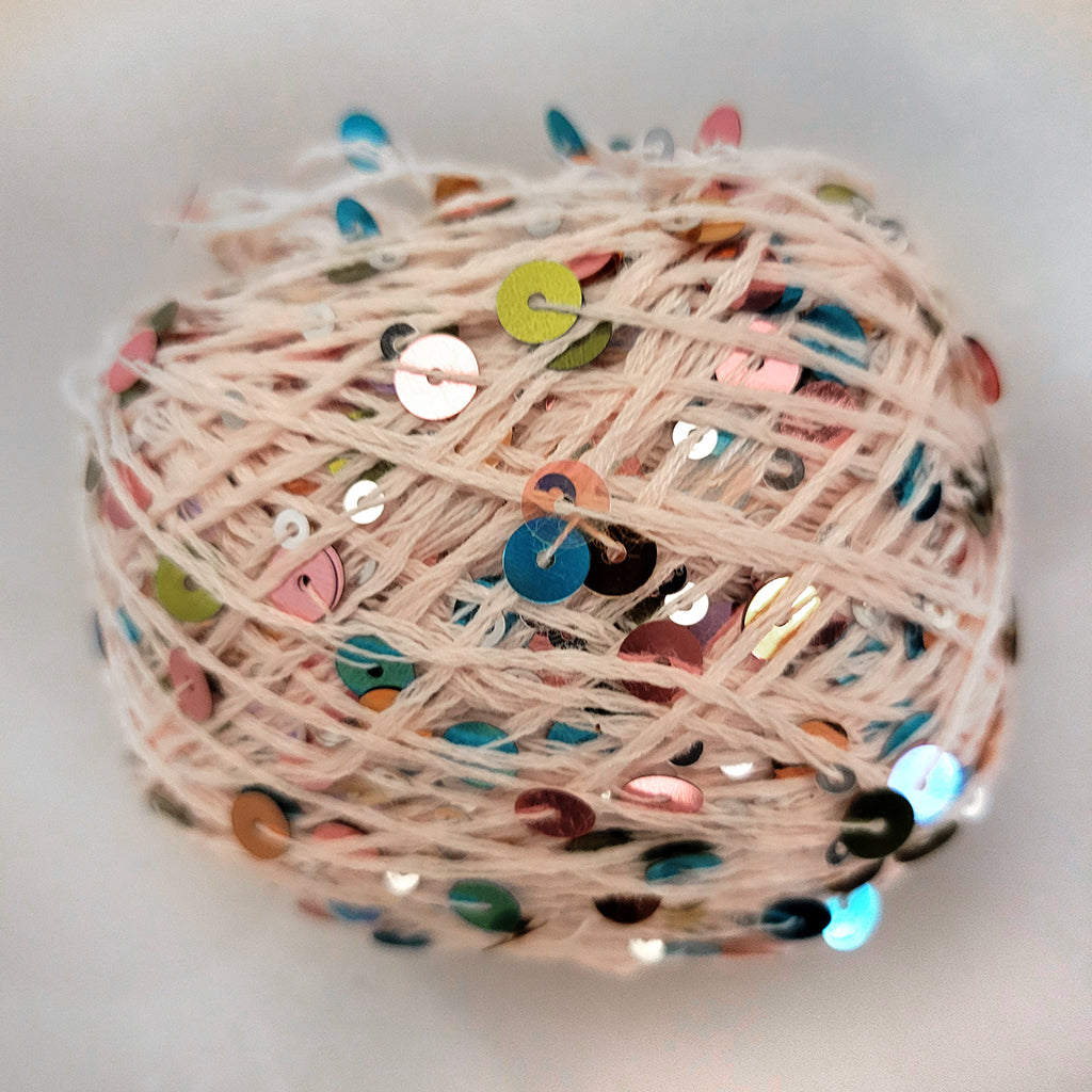 Sips from the Bling Bar. Much like a fine wine, this carry-along yarn is a full body cotton yarn with sparkly notes; the perfect pairing with your favorite yarn.