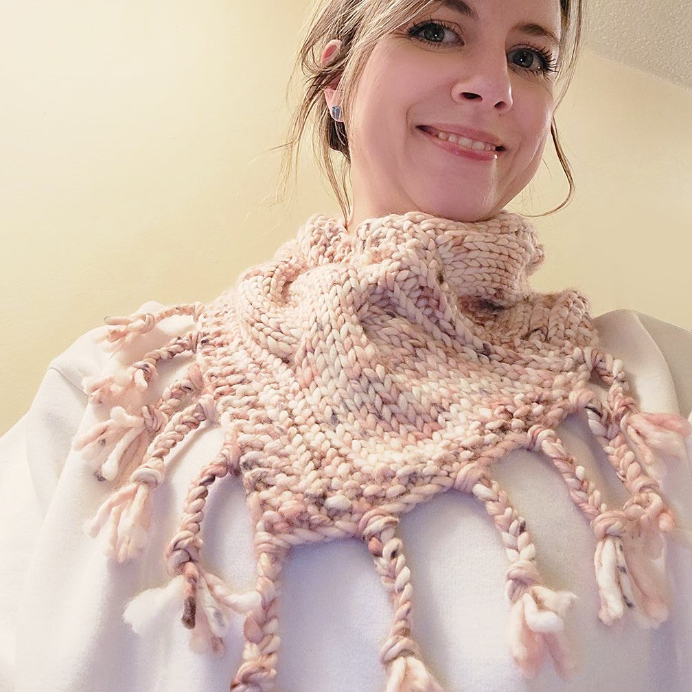 Bestie Bandana is the coolest Bandana this season! It’s perfect for the cooler months, and you won’t want to pack it away for Spring or Summer either. Knit with a bulky-weight yarn, Bestie Bandana is a quick & fun knit; make a few for you and one for your bestie. Worn around the neck, this bandana is the go-to fashion accessory of the season; easy to wear, simple to make!