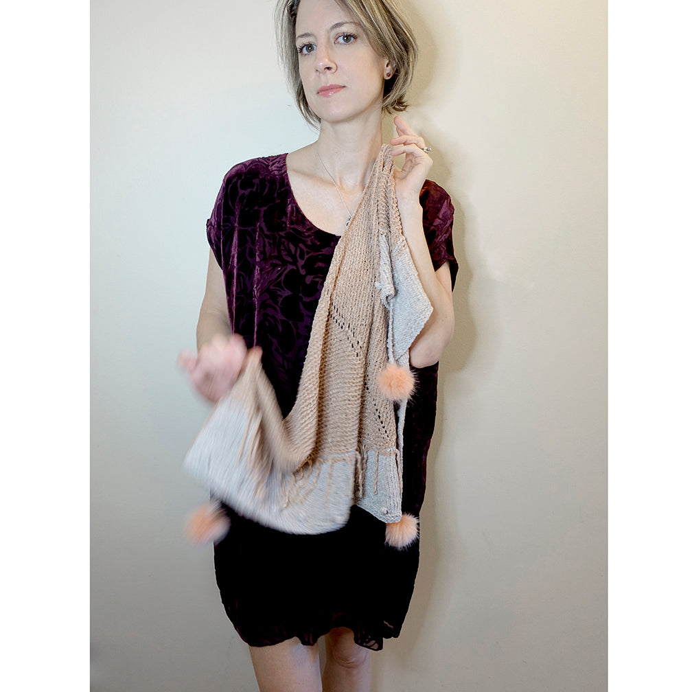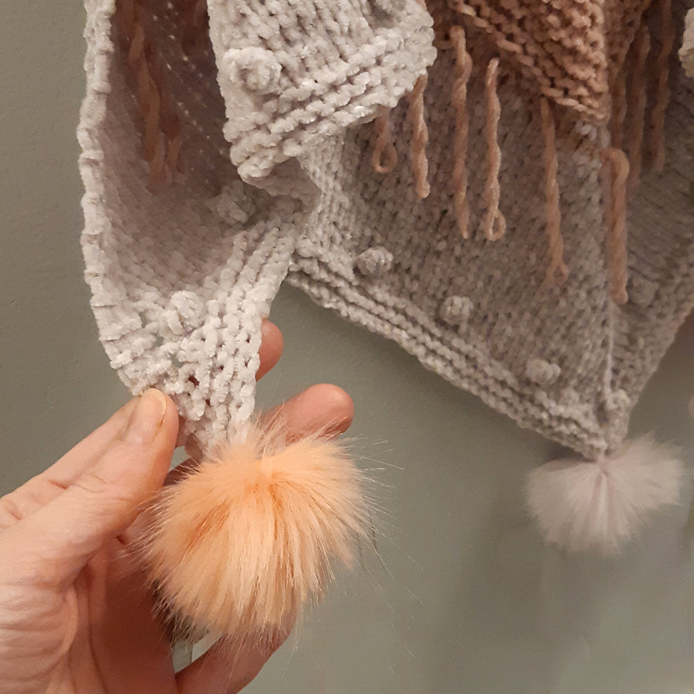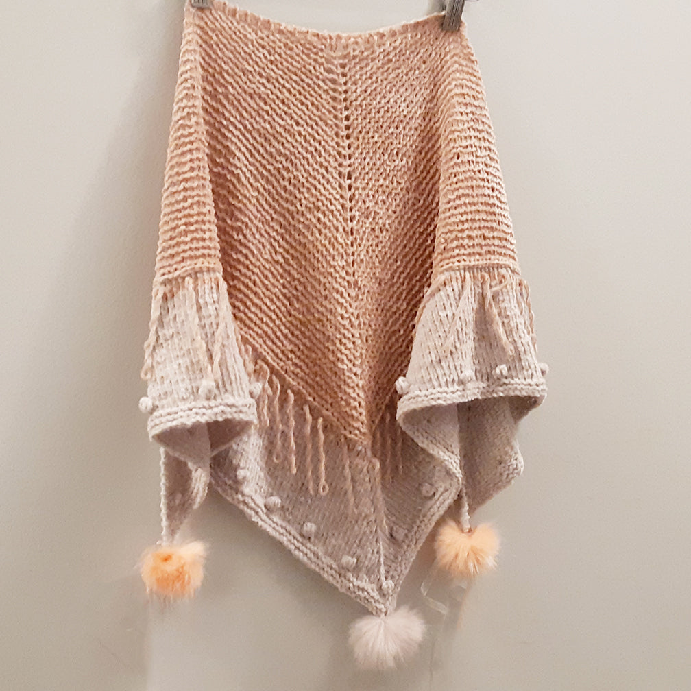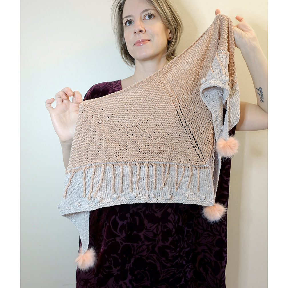This is the perfect petite size shawl to delicately drape over your shoulders and wrap around your neck. The fun knit-in Tassel loops, bobbles, and cute mini pompoms are a delightful details that make this shawlette extra special. A Traditional top-down triangle shape, this shawl starts with a Tab Cast On in the main color and worked in Garter St. A horizonal knit stich is worked (binding off and then casting on again) and a new contrast color is worked in St-st for the remaining of the shawlette, after the main colored tassel loops are worked. Little bobbles along the edge are made before the simple Garter edge. Mini pompoms are placed for the final detail! I know you will fall in love with the Petite Shawlette!
