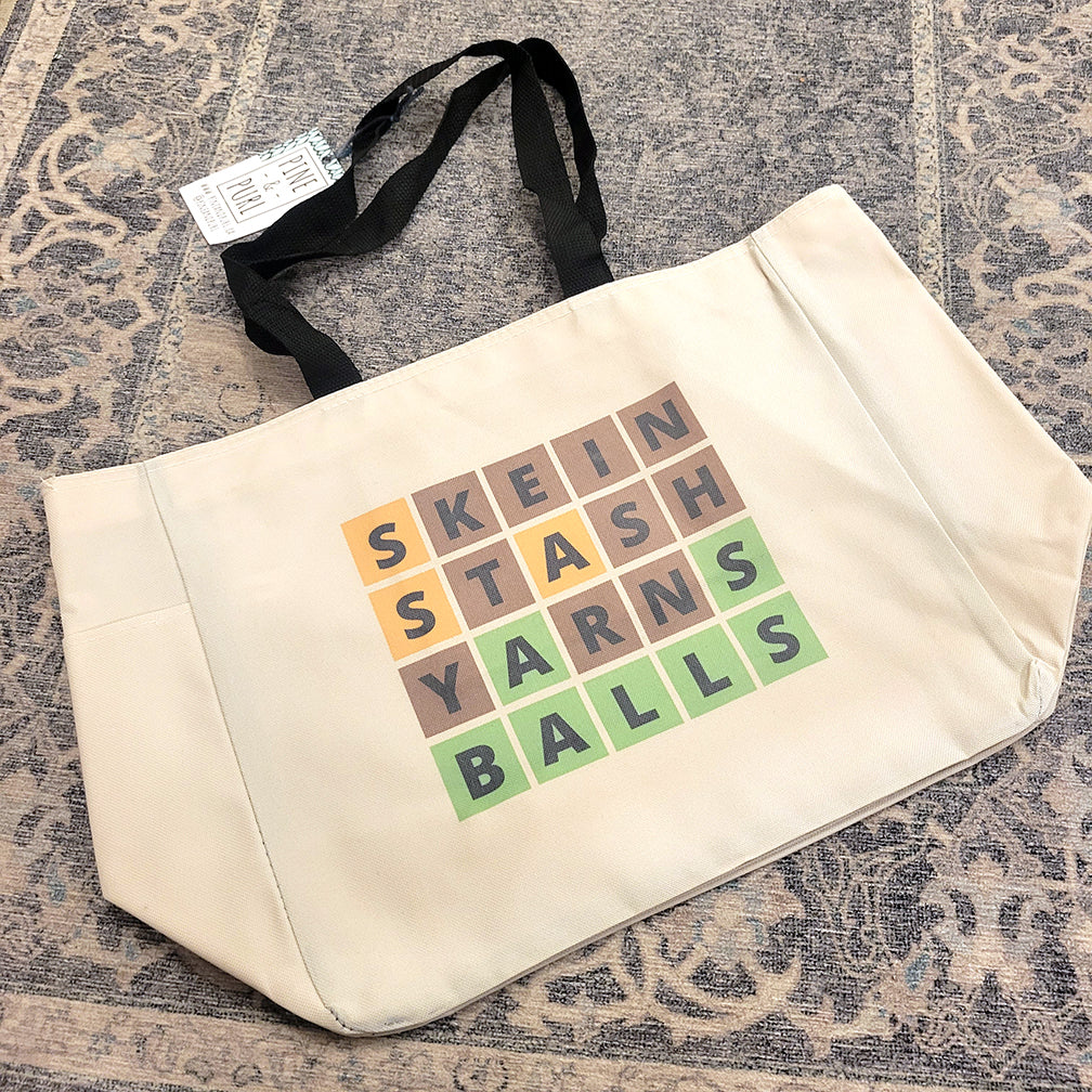 A tote bag that's large, durable and so useful! This 18L capacity bag can carry all your yarn store purchases or a large-sized project. A pocket on the side is perfect for carrying a travel mug or water bottle, and a handy interior stash pocket can hold small notions, accessories, or your keys. A sturdy gusseted bottom makes this bag stand on it's own without flopping over, making it perfect to knit or crochet from.