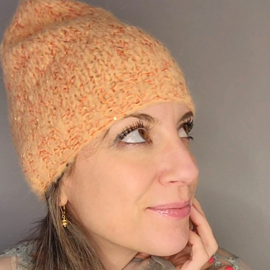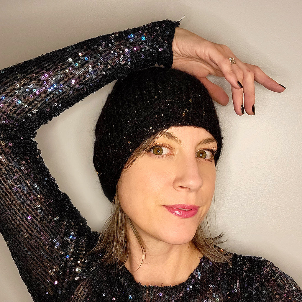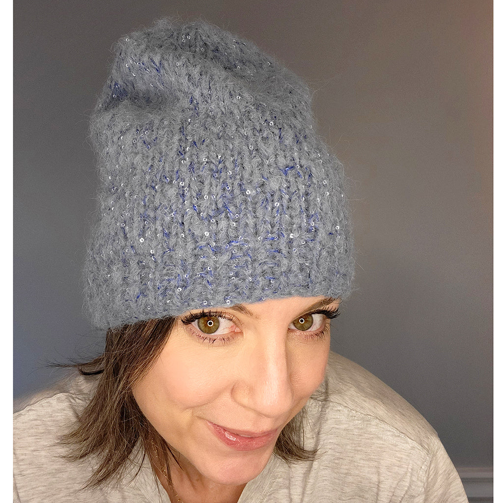During uncertain times, I seek comfort in making.  Sparkle Smush Hat is the perfect project to bling joy and happiness. With a luxurious fluffy smushy Suri Alpaca paired with Mega Bling sparkles, the combo makes a super soft and sparkly fabric; this hat will hug your head, keep you warm and make you razzle dazzle.